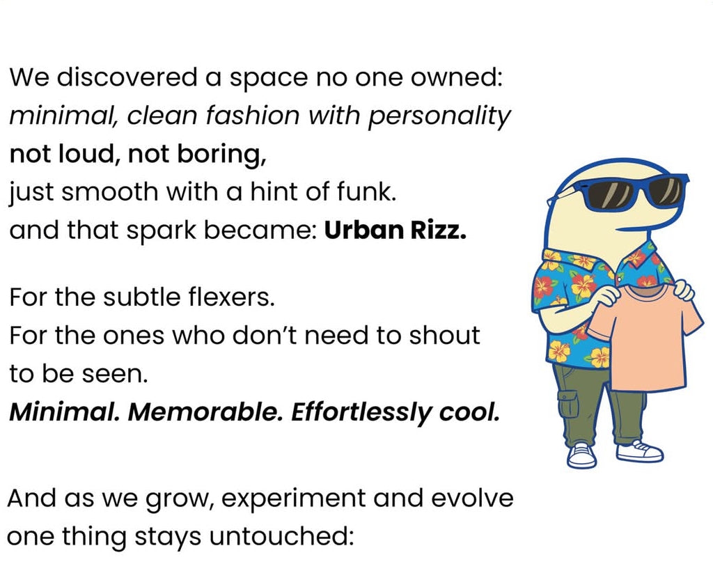 Rizzentials is made for a generation that values comfort, confidence, and clean style. Designed with minimal aesthetics , these are everyday essentials that don’t try too hard but still stand out.